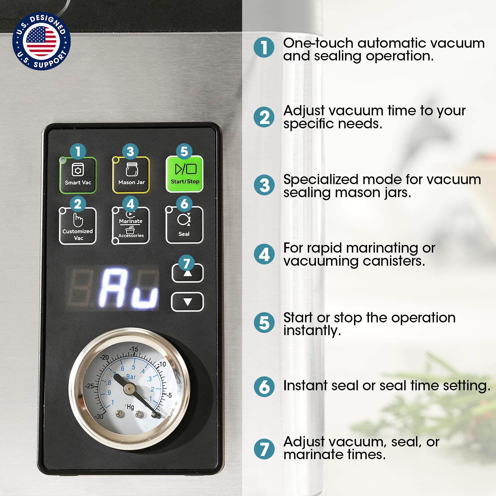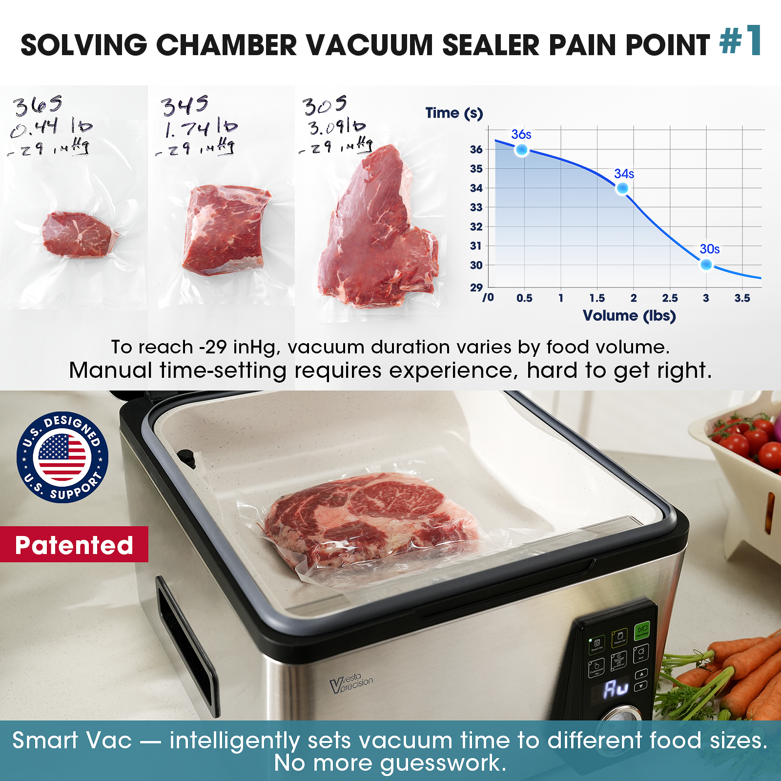 - SmartVac Intelligent Control: Eliminates the guesswork of manual timers. Our patented system automatically detects food volume to set the vacuum cycle for you. This ensures a perfect seal for both liquids and solids—no over-vacuuming or under-vacuuming, just precise results at the touch of a button.