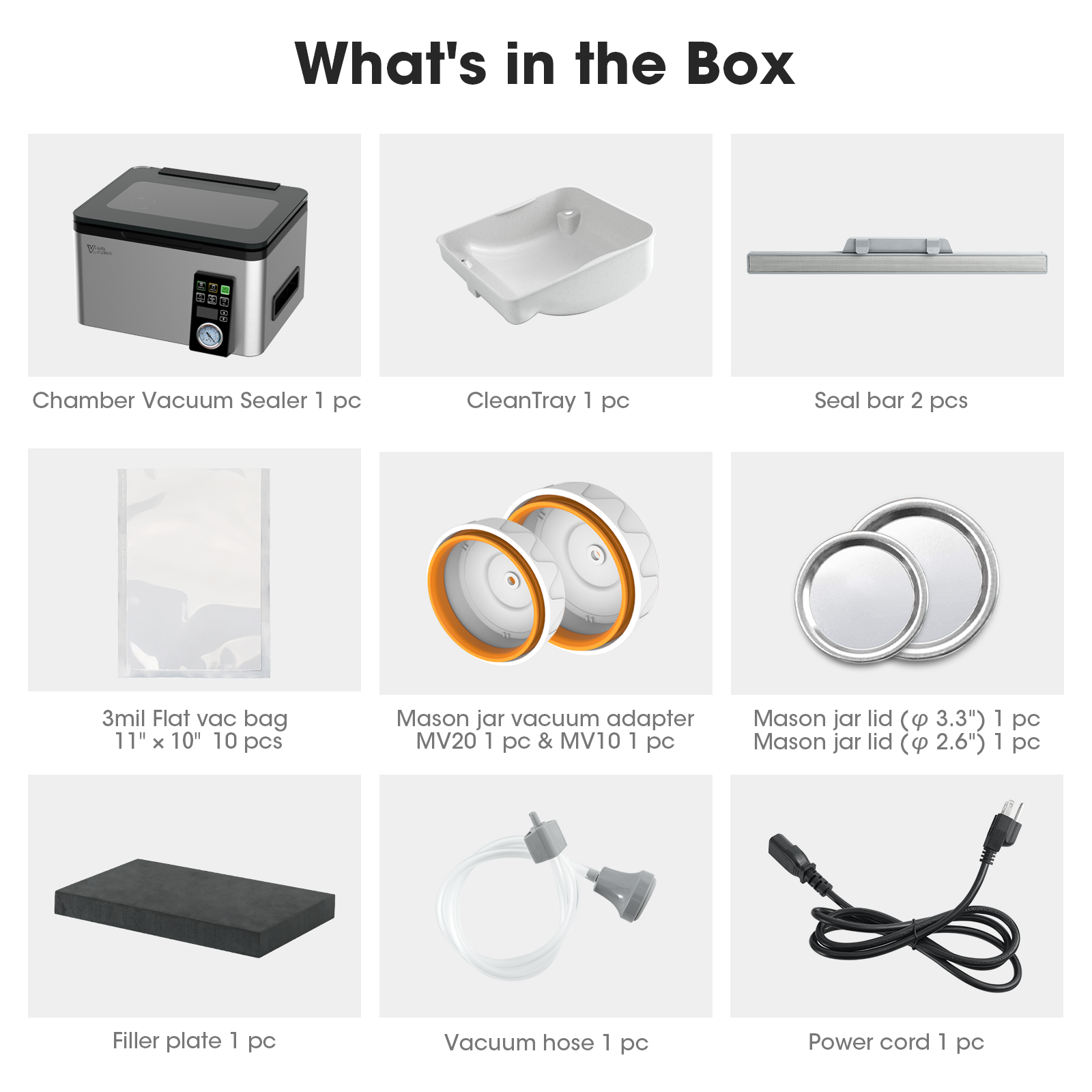 - Universal Mason Jar Sealing: Includes universal adapters to vacuum seal jars of all sizes—even tall ones that won't fit inside the chamber. Easily create a secure, airtight seal to preserve jams, pickles, and dry goods using the external accessory port.